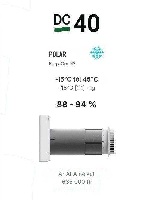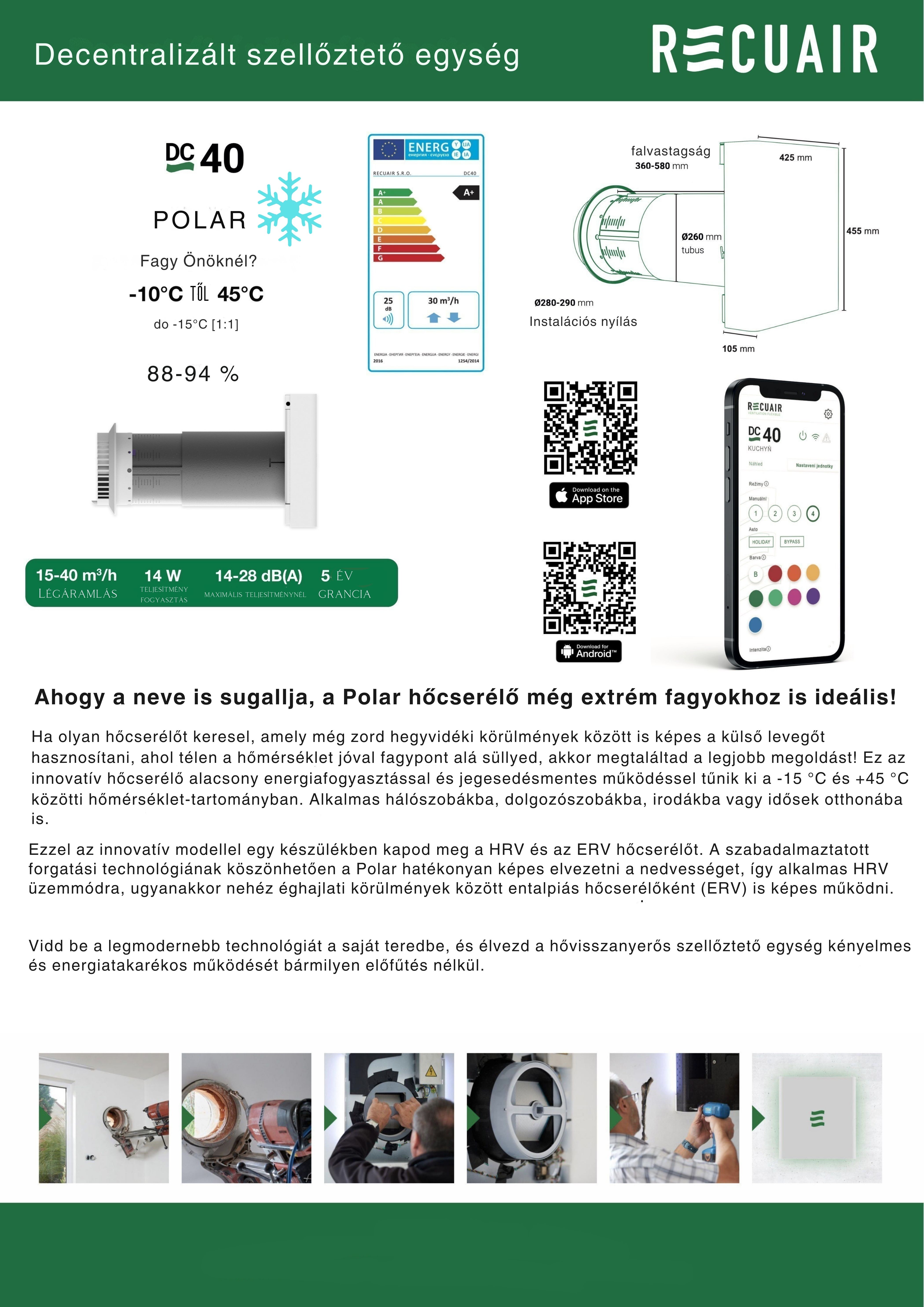 A RECUAIR DC40 POLAR egy speciálisan fejlesztett szellőztető rendszer, amely extrém hideg körülmények között is hatékonyan működik, és biztosítja az otthon folyamatos friss levegő ellátását.